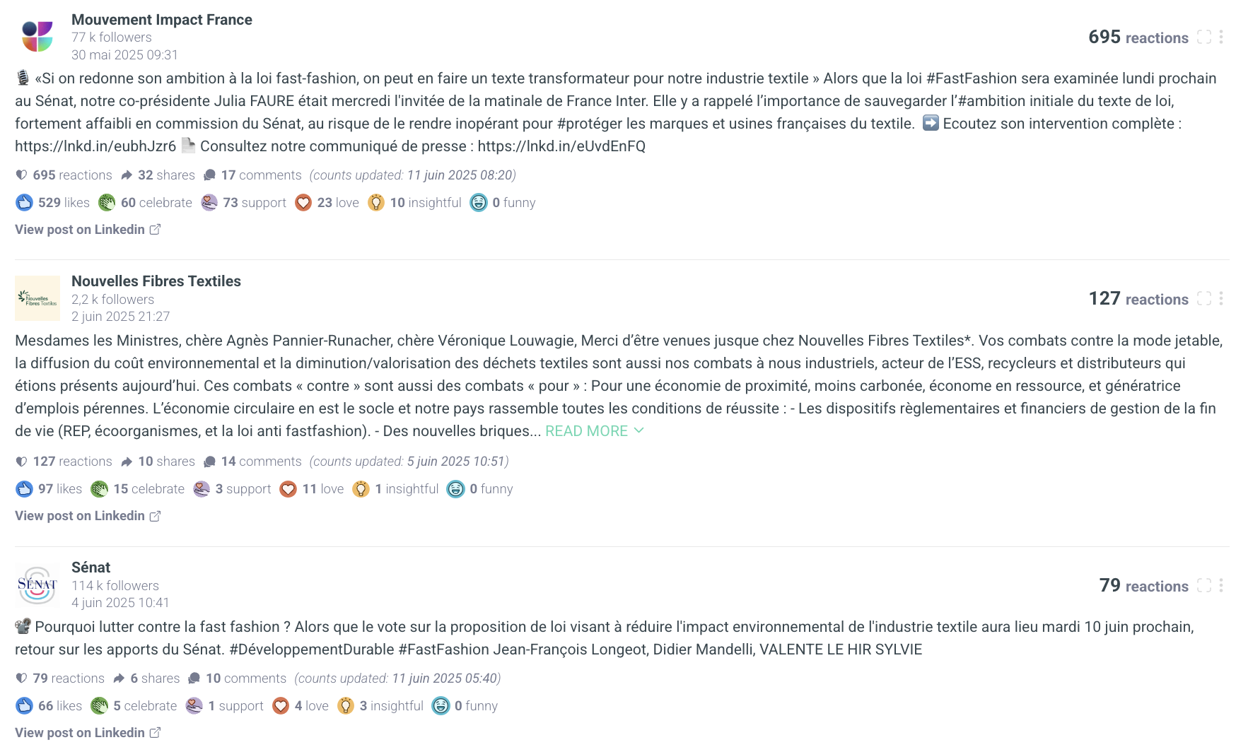 À noter que le Sénat tire son épingle du jeu en matière de communication sur LinkedIn autour de la fast fashion, en adoptant un ton pédagogique. À travers des publications telles que « Loi anti fast fashion : pourquoi ce texte ? », « Pourquoi lutter contre la fast fashion ? » ou encore des explications sur les enjeux du projet de loi, l’institution cumule plus de 130 réactions, confirmant l’intérêt croissant des communautés LinkedIn pour ces sujets de société, même lorsqu’ils sont portés par des acteurs institutionnels.