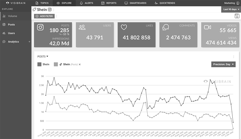 La veille autour de la marque Shein est le parfait exemple pour cet article. Sur Instagram, par exemple, plus de 180 200 posts ont été publiés en l’espace de 3 mois.