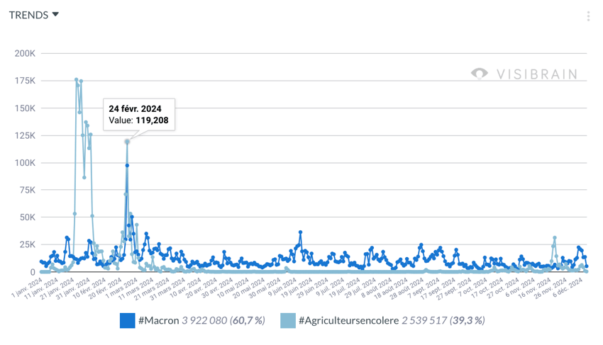 Le Président de la République s’impose comme la personnalité dont on parle le plus sur X dans l’hexagone. Pourtant, avec ses 3,9 millions de mentions, le hashtag #Macron perd du terrain face à 2023 (volume de messages en diminution de 27%). Son nombre de mentions grimpe en flèche lors de sa visite au salon de l’agriculture au moment du mouvement des #Agriculteursencolere (près de 120k messages en 24 heures).
