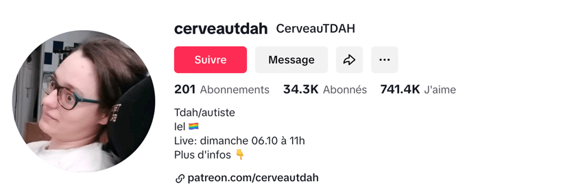 Les contenus liés aux troubles de l’attention avec ou sans hyperactivité (TDAH) sont aussi très présents, avec de nombreux témoignages illustrant les symptômes caractéristiques du TDAH à travers des compilations d’actions quotidiennes. Le compte Cerveautdah, animé par une utilisatrice atteinte de TDAH et autiste, offre une analyse nuancée du trouble en l’abordant sous divers aspects tels que l’alimentation, les médicaments, les émotions, le sport ou encore le voyage.